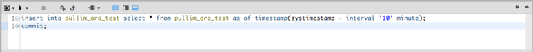 INSERT INTO PULLIM_ORA_TEST SELECT * FROM PULLIM_ORA_TEST AS OF TIMESTAMP(SYSTIMESTAMP – INTERVAL ‘5’ MINUTES);