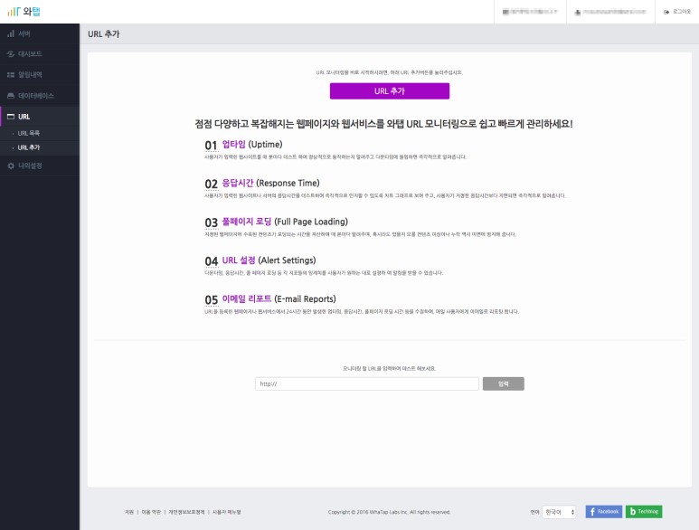 URL 모니터링 기능으로써 추가한 URL을 일정 시간마다 모니터링해서 업타임, 응답시간, 풀 페이지 로딩, 경고 알람 설정, 이메일 리포트 등이 가능하다.