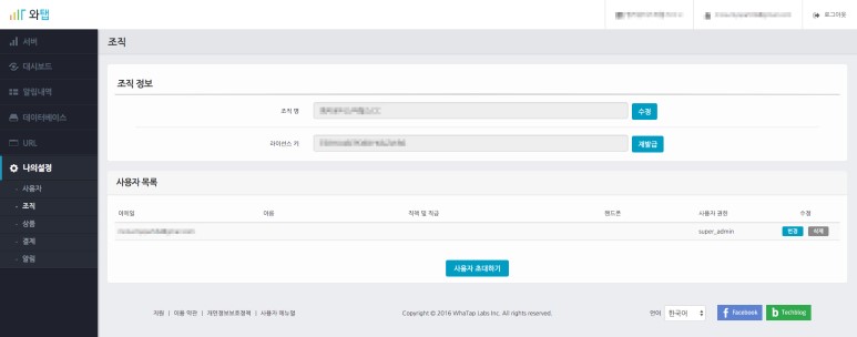 소속된 조직명을 수정하거나 라이센스 키를 재 발급받을 수 있다.