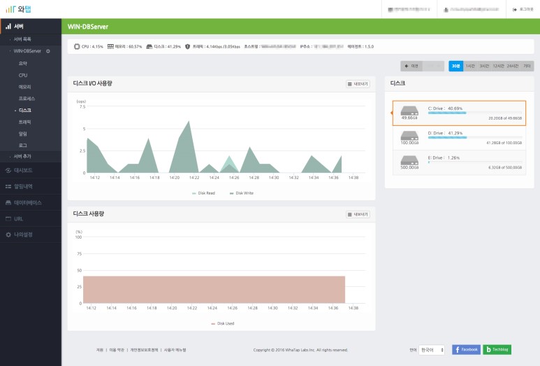 디스크 I/O 사용량과 전체 용량 대비 사용량.. 파티션 별 사용량을 확인 가능하다.