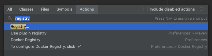 한 가지 더 세팅을 해주어야 하는데, Command + Shift + A를 눌러서 Action 검색창을 띄워준 후 registry라고 입력하면 아래와 같이 Registry를 실행할 수 있도록 액션이 목록에 뜬다.