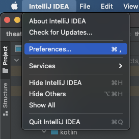 우선 첨부된 이미지와 같이 좌측 상단의 IntelliJ IDEA를 클릭하고 Preferences 를 클릭하여 설정 창을 열어준다.