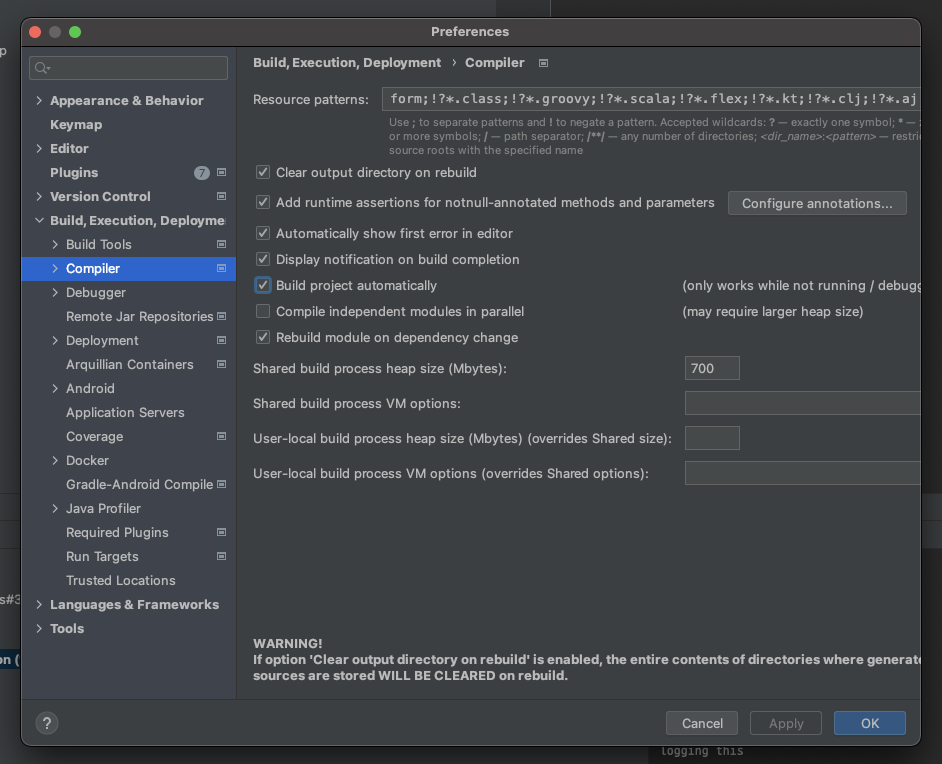 그 다음 아래와 같이 좌측 탭에서 Build, Execution, Deployment 화살표를 클릭하여 서브메뉴를 열어준 뒤 Compiler을 선택해준 다음, Build project automatically 에 체크해준 다음 OK 버튼을 눌러서 창을 닫아준다.