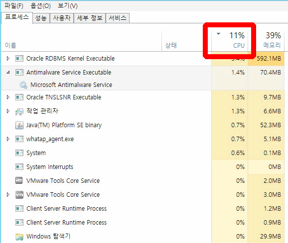 이 녀석들을 잡고 나니 CPU 점유율이 정상으로 돌아왔다.