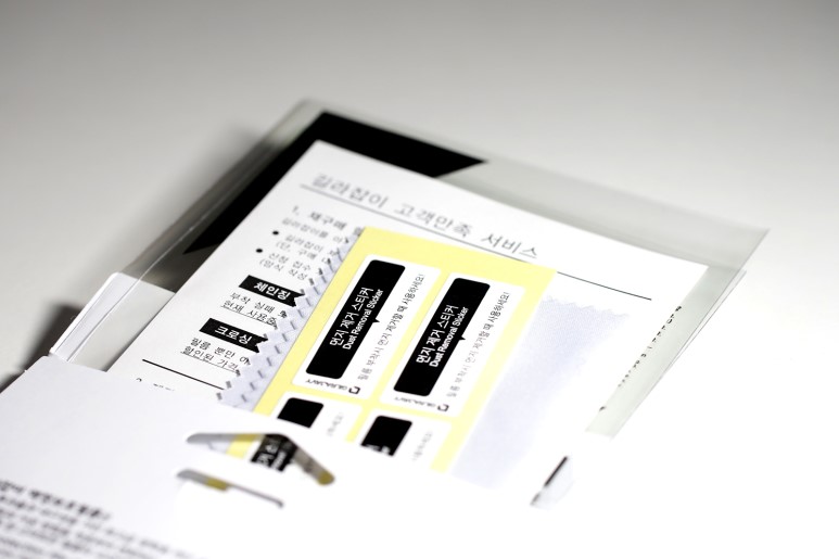 내부에는 서비스 가이드 및 고객만족 서비스 설명문과 융, 먼지 제거 스티커, 밀개(?), 그리고 보호필름 본품이 동봉 되어 있군요.